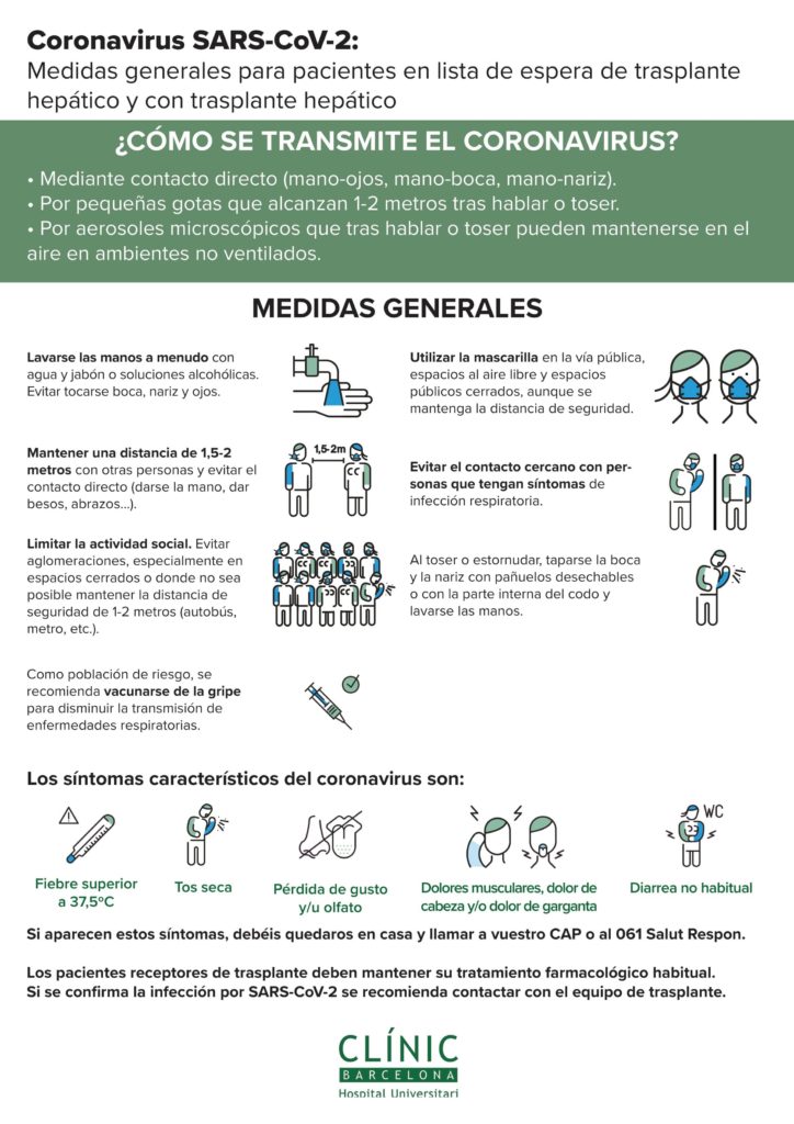 Coronavirus SARS-CoV-2: Medidas generales para pacientes en lista de espera de trasplante hepático y con trasplante hepático La enfermería de la Unidad de Trasplante Hepático del Hospital Universitari Clínic de Barcelona, ha preparado éste pòster, con las medidas...