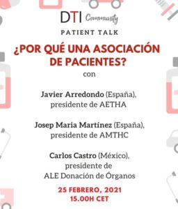 El 25 de febrero se celebró una Patient Talk organizada por la DTI Community sobre la importancia de las asociaciones de pacientes. La DTI Community es una comunidad mundial de referencia en donación de órganos para trasplantes que promueve la transferencia de conocimientos y la evolución de las competencias profesionales en la donación de órganos.